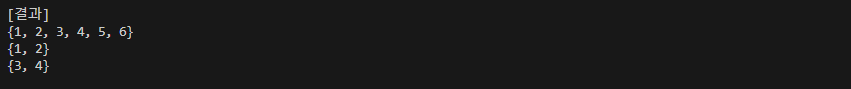 print(set1 | set2) # 합집합: {1, 2, 3, 4, 5, 6}