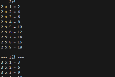 반복문을 이용해 2단부터 9단까지의 곱셈 결과를 출력합니다. 바깥쪽 for문은 단(dan)을 2부터 9까지 반복하고, 안쪽 for문은 각 단에 대해 1부터 9까지 곱하는 연산을 수행합니다. 각 곱셈 결과는 print 함수를 통해 형식에 맞춰 출력되며, 각 단 사이에는 시각적인 구분을 위해 빈 줄을 추가하였습니다.