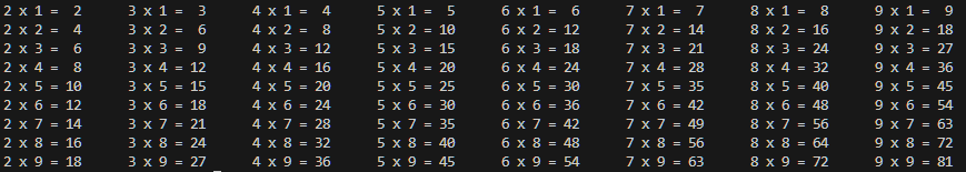print(f"{dan} x {i} = {dan * i:2}", end="\t") # 탭 간격으로 정렬