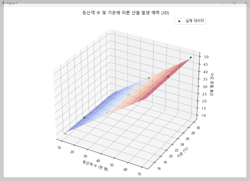 ax.set_title('등산객 수 및 기온에 따른 산불 발생 예측 (3D)')