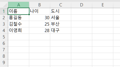 - ws.cell(row=1, column=4, value="성적")으로 네 번째 열의 첫 번째 행(헤더)에 "성적"이라는 이름을 추가합니다.